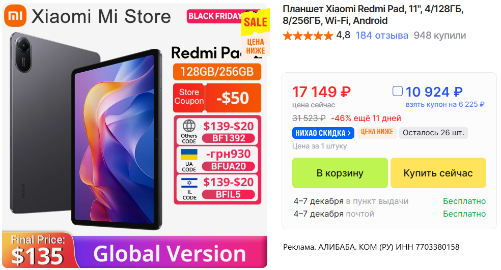 • Планшет Xiaomi Redmi Pad 2 8/256 Гб за 10924₽ с купоном на 6225₽. Ещё есть 4/128 Гб за 9033₽. Металлический корпус, экран 11", процессор MediaTek Helio G100, глобальная версия, аккумулятор 9000 мАч.