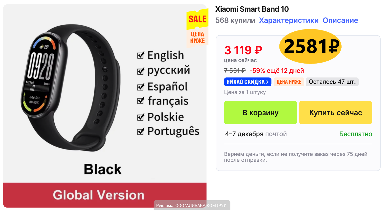 • Смарт браслет Xiaomi Smart Band 10 за 2581₽ с купоном на 538₽. Дисплей 1.72", корпус из алюминия, влагозащита 5 АТМ, до 3 недель работы, 150 спортивных режимов, Bluetooth 5.4.