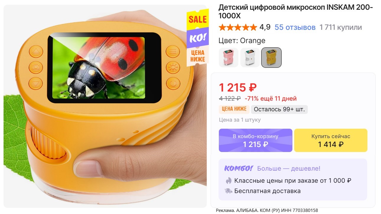 • Детский цифровой микроскоп INSKAM за 1215₽ при покупке через Комбо-корзину. IPS-экран 2" с 8 светодиодами, бесступенчатое увеличение от 200 до 1000, функция съёмки 2 МП, хранение данных и передача по USB.