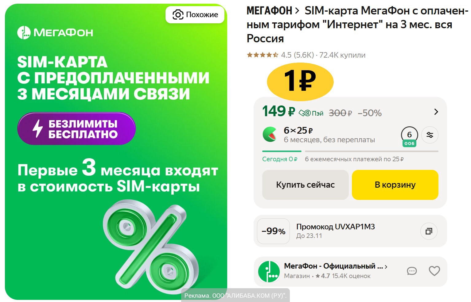 • SIM-карта МегаФон с оплаченным тарифом "Интернет" на 3 мес. вся Россия с кодом: UVXAP1M3 за 1₽. Он с фиксированной абонентской платой. Подключение через приложение с подтверждением на Госуслугах, подходит для переноса номера.