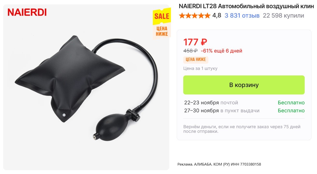 • Пневмоклин NAIERDI LT28 за 177₽. Многофункциональный инструмент из полиуретанового термопластичного эластомера, поможет при установке окон и дверей или приоткрыть дверь заблокированного автомобиля.