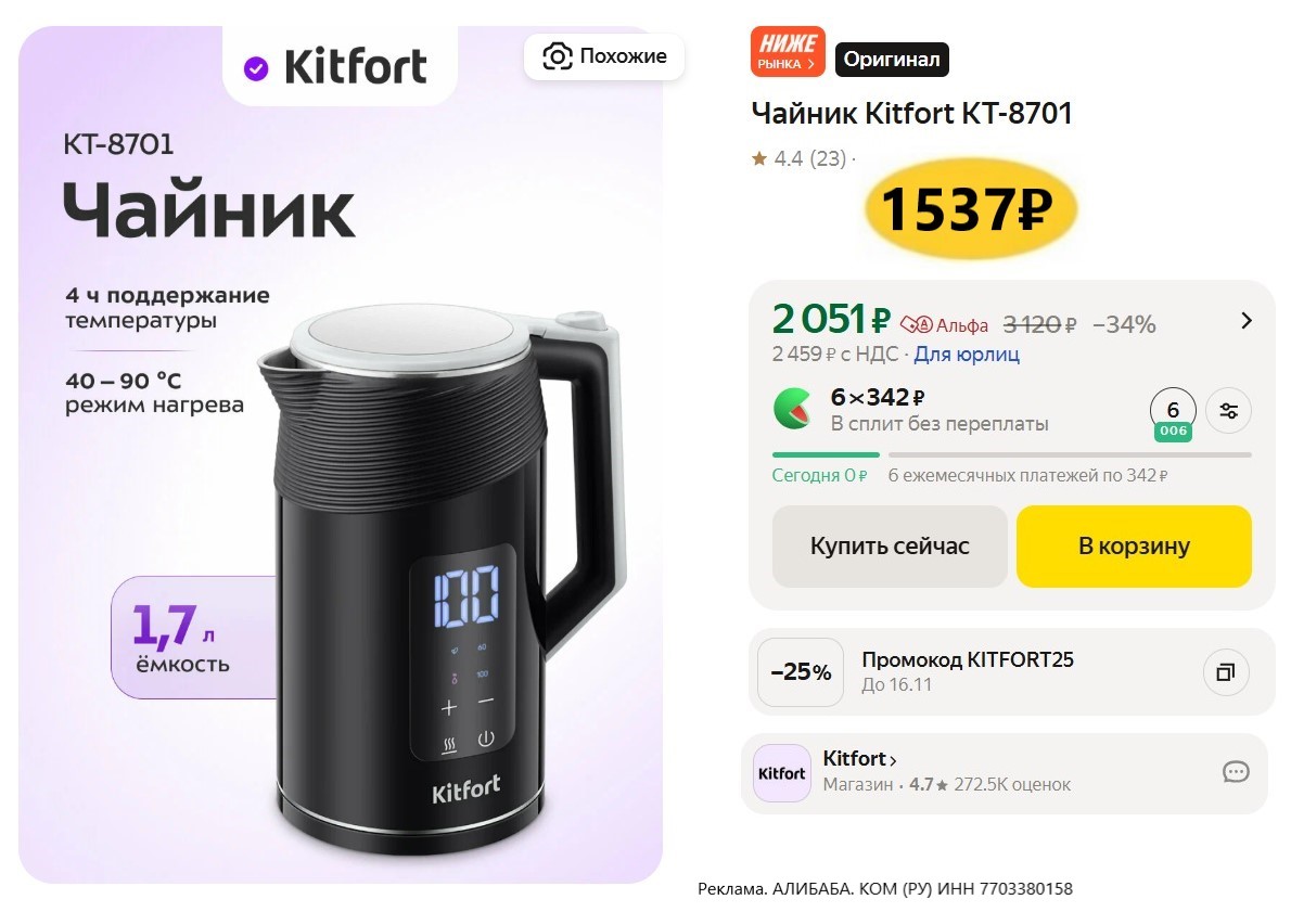 • Чайник Kitfort КТ-8701 с кодом: KITFORT25 за 1505₽. Обычно от 2200₽. Объём 1.7 л, мощность 2200 Вт, поддерживает температуру от 40°C до 90°C, защита от накипи.