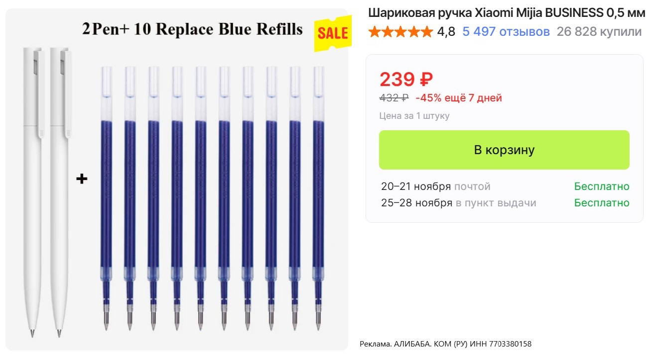 • Шариковая ручка Xiaomi Mijia BUSINESS за 239₽. В наборе 2 ручки и 10 синих, чёрных или красных стержней 0.5 мм, пишут мягко и чётко.