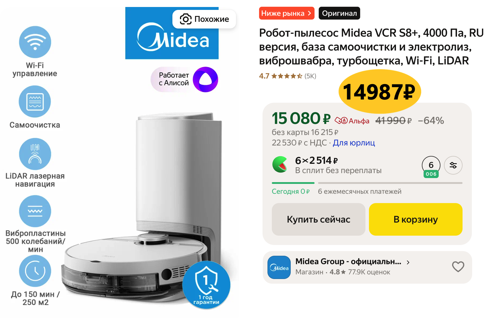 • Робот-пылесос Midea VCR S8+ с кодом: SEP-AF за 14987₽. Выполняет сухую и влажную уборку до 180 мин, есть Wi-Fi, работает с Алисой, оснащён датчиками препятствий и перепада высот.