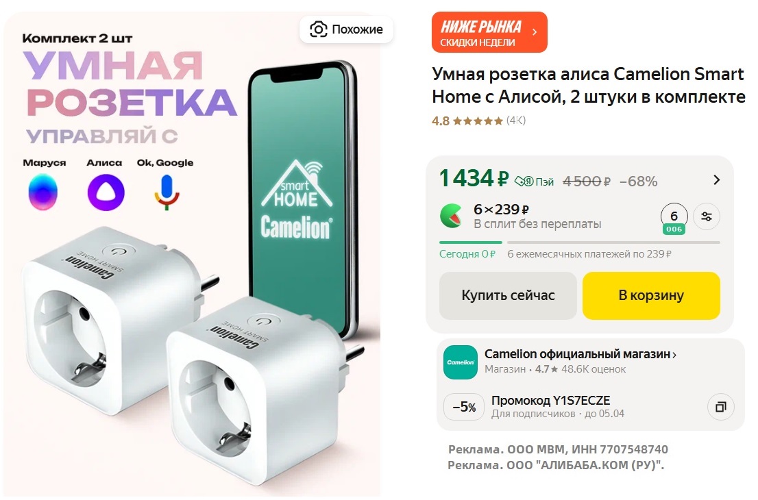 • Розетка Camelion Smart Home с Алисой, 2 шт. за 1363₽ с кодом: Y1S7ECZE за подписку на магазин. Выходит 681₽/шт. Управление через приложение с нагрузкой до 4000 Вт, подключение по Wi-Fi 2.4 ГГц для контроля бытовых приборов.