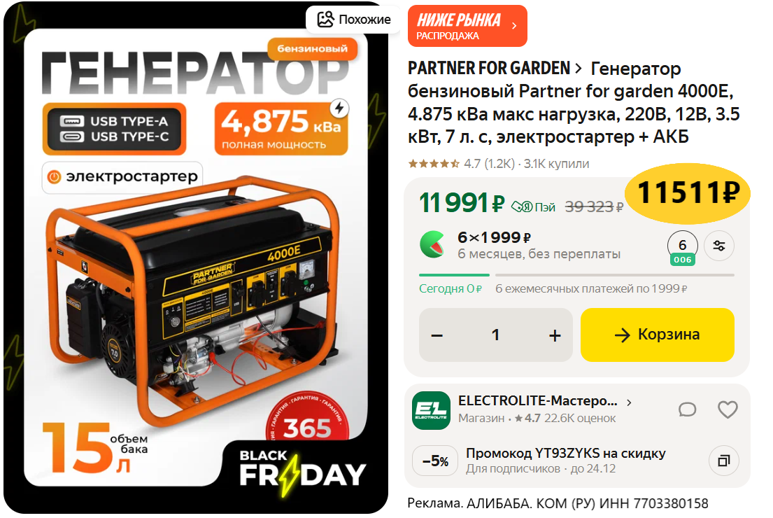 • Генератор бензиновый Partner for garden 4000Е за 11511₽ с кодом: YT93ZYKS за подписку. Экономичный 4-тактный двигатель 7 л.с, защита от перегрузки, розетки 220В/12В, топливный бак 15 л.