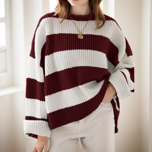 🌀Suéter de punto de manga larga para mujer, cuello redondo, a rayas, bloque de color, cómodo, holgado, de gran tamaño, Rojo -, L ❗️ #Amazon 🇪🇸