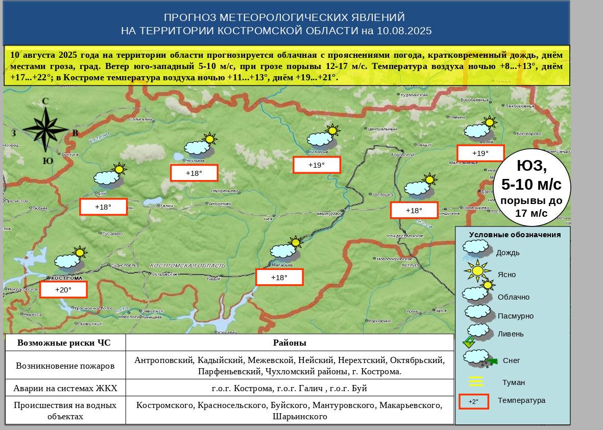 10 августа 2025 года на территории области прогнозируется облачная с прояснениями погода, кратковременный дождь, днём местами гроза, град. Ветер юго-западный 5-10 м/с, при грозе порывы 12-17 м/с. Температура воздуха ночью +8...+13°, днём +17...+22°; в Костроме температура воздуха ночью +11...+13°, днём +19...+21°