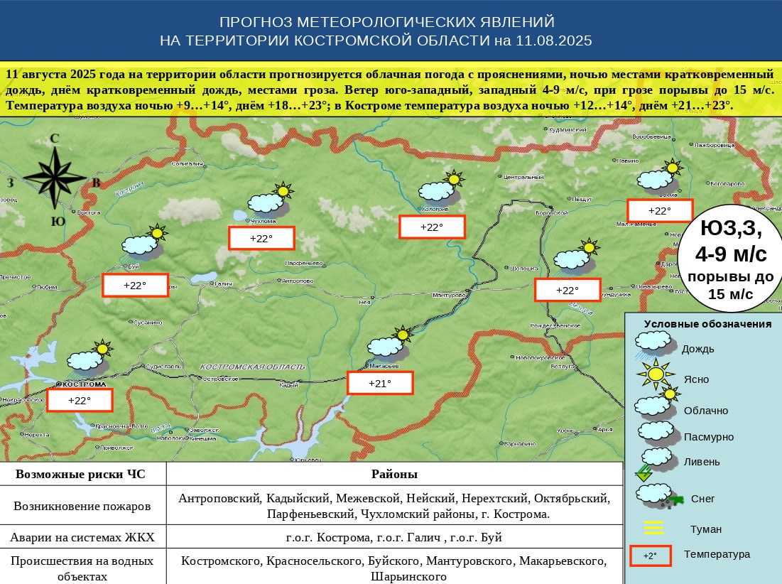 11 августа 2025 года на территории области прогнозируется облачная погода с прояснениями, ночью местами кратковременный дождь, днём кратковременный дождь, местами гроза. Ветер юго-западный, западный 4-9 м/с, при грозе порывы до 15 м/с. Температура воздуха ночью +9…+14°, днём +18…+23°; в Костроме температура воздуха ночью +12…+14°, днём +21…+23°.