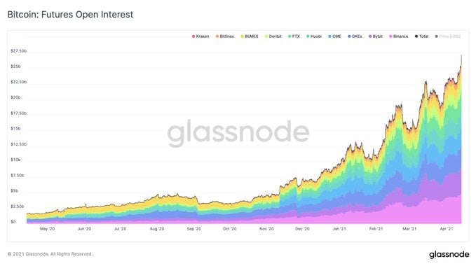 На фоне такого позитивного тренда открытый интерес к фьючерсам на BTC впервые превысил $27 млрд. Об этом говорится в отчете команды Glassnode.