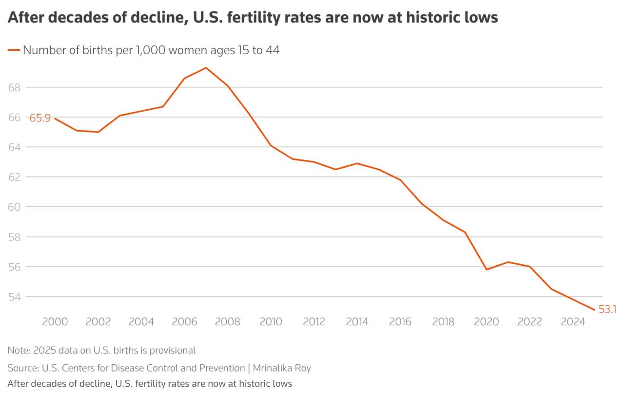 Будни демографического кризиса. Уровень рождаемости в США продолжает быстро падать. В 2025 году индекс фертильности сократился до рекордно низкого показателя в 1,57 ребёнка на одну женщину. За последние восемнадцать лет рождаемость в Америке упала на четверть.