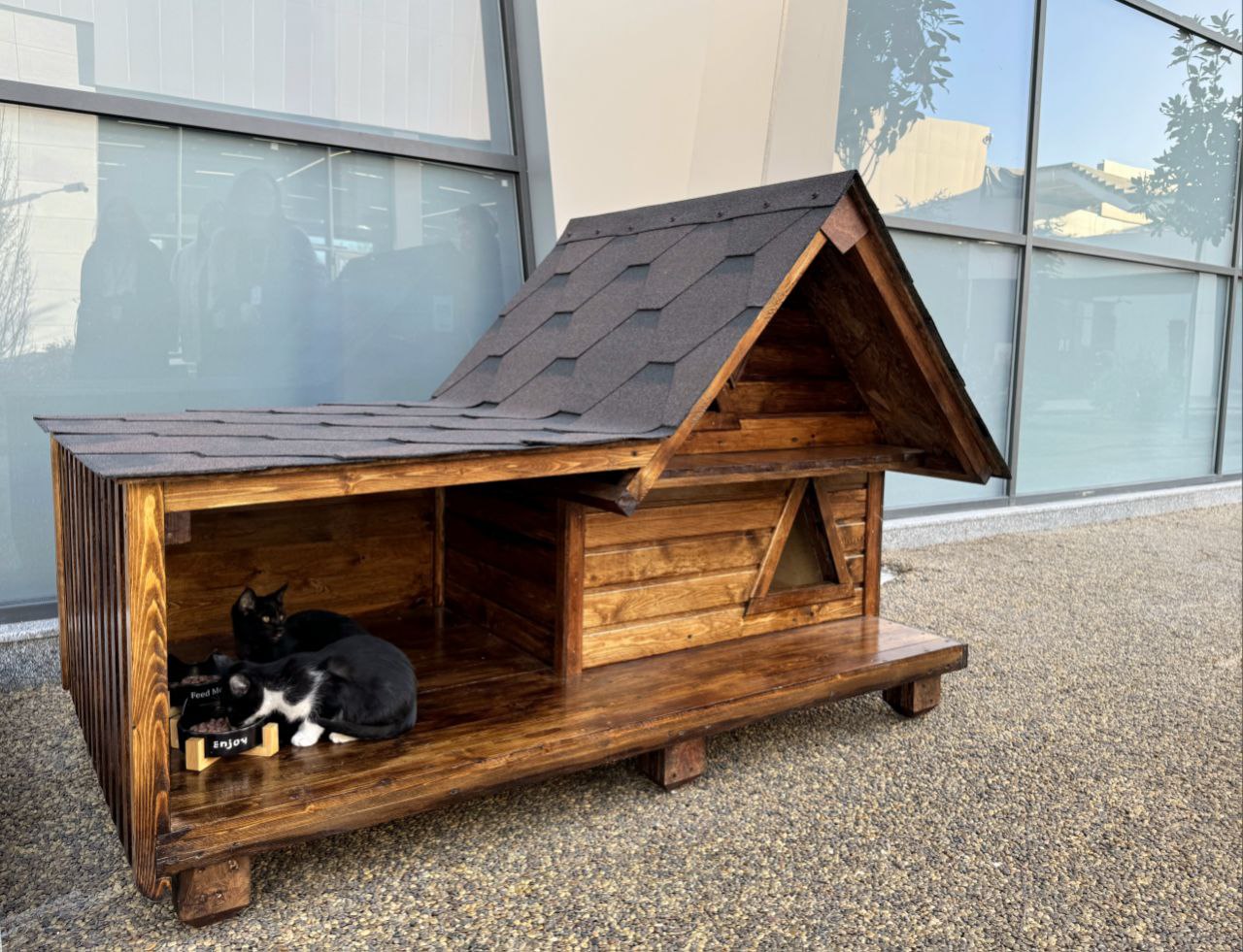 Директор Кофейни Шухрат ооочень любит кошек и попросил поставить домик рядом,чтобы можно было приглядывать за ним и почаще наливать молочко котейкам.