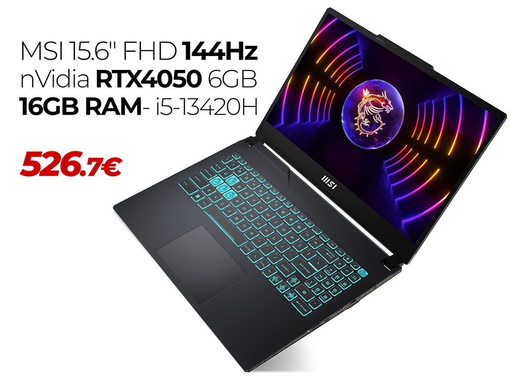 MSI 15.6" 144HZ FHD nVidia RTX4050 - i5-13420H - 16GB RAM - 512GB SSD ►526.67€