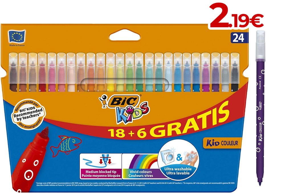 24 rotuladores BIC KIDS - punta media - tinta con base de agua fácil de lavar ►2.19€