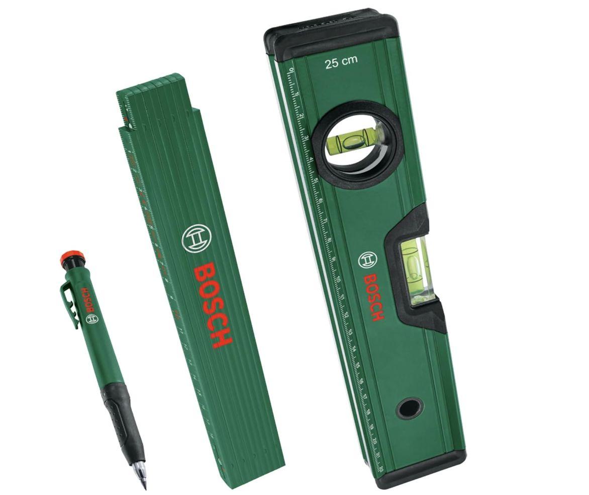 ๐ Bosch Juego de marcado y alineaciรณn precisos con nivel de burbuja de 25 cm, regla plegable de 2 m y lรกpiz marcador. #Amazon