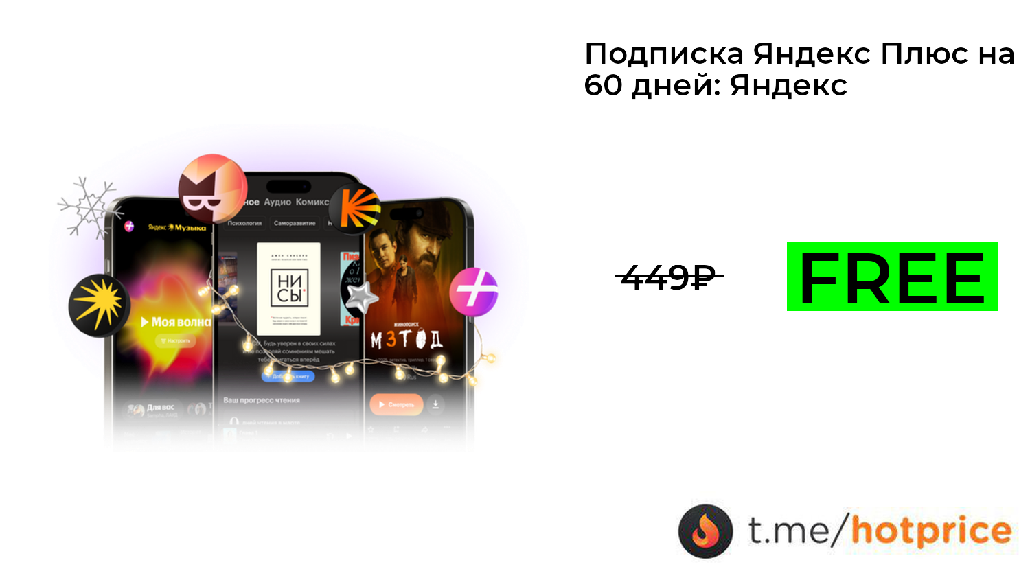 🔹 Подписка Яндекс Плюс на 60 дней: Яндекс Книги, Музыка, Кинопоиск и др. (для новых и без активной + доп. опции) за 0₽ ❗️ (везде: 449+₽)