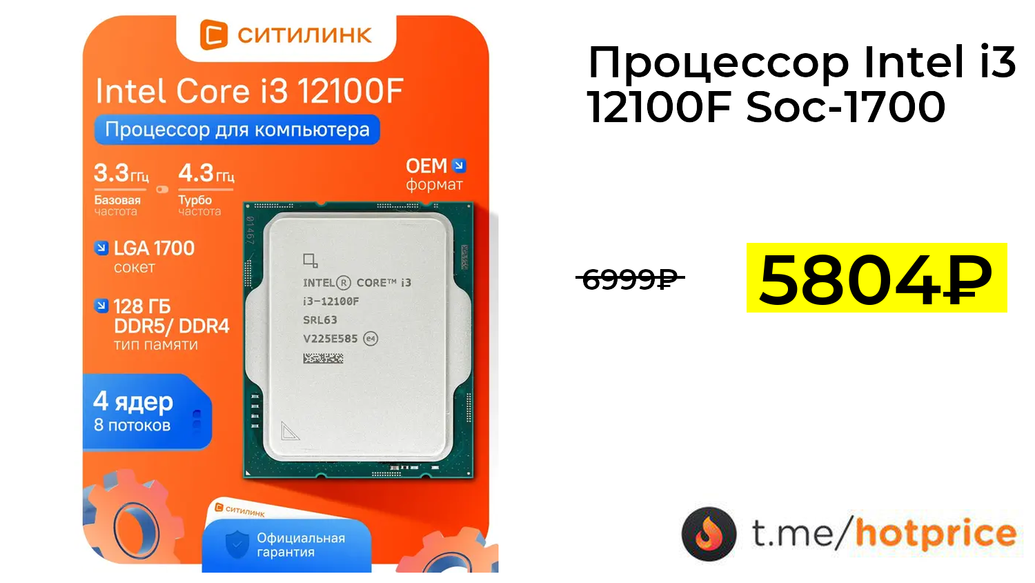 🔹 Процессор Intel i3 12100F Soc-1700 за 5804₽ ❗️ (везде: 6999+₽)