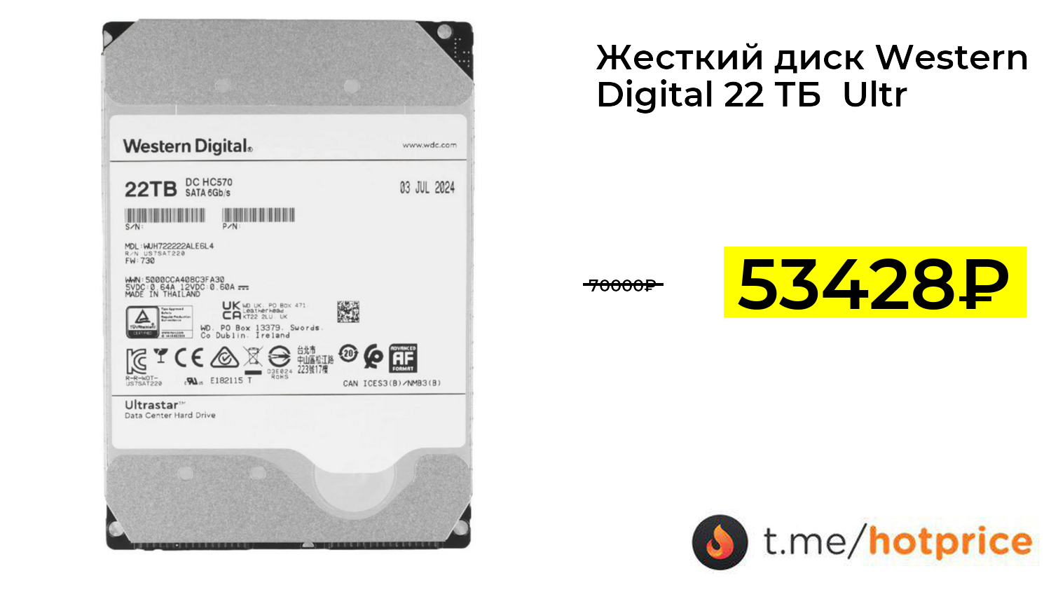 🔹 Жесткий диск Western Digital 22 ТБ Ultrastar DC HC570 (с картой OZON) за 53428₽ ❗️ (везде: 70000+₽)