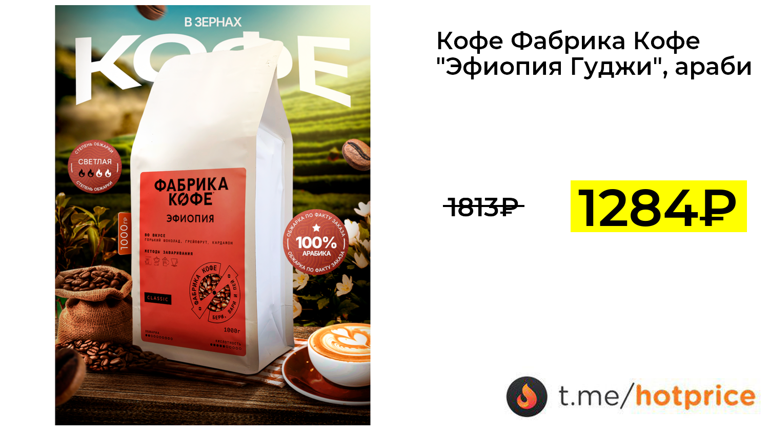🔹 Кофе Фабрика Кофе "Эфиопия Гуджи", арабика, 100%, светлая обжарка, 1 кг за 1284₽ ❗️ (везде: 1813+₽)