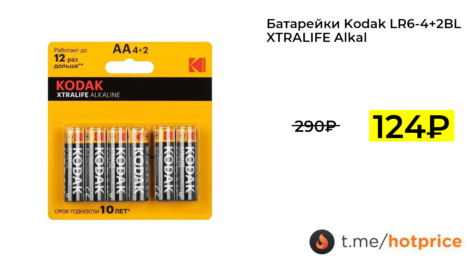🔹 Батарейки Kodak LR6-4+2BL XTRALIFE Alkaline (6 шт, щелочные) с картой OZON за 124₽ ❗️ (везде: 290+₽)
