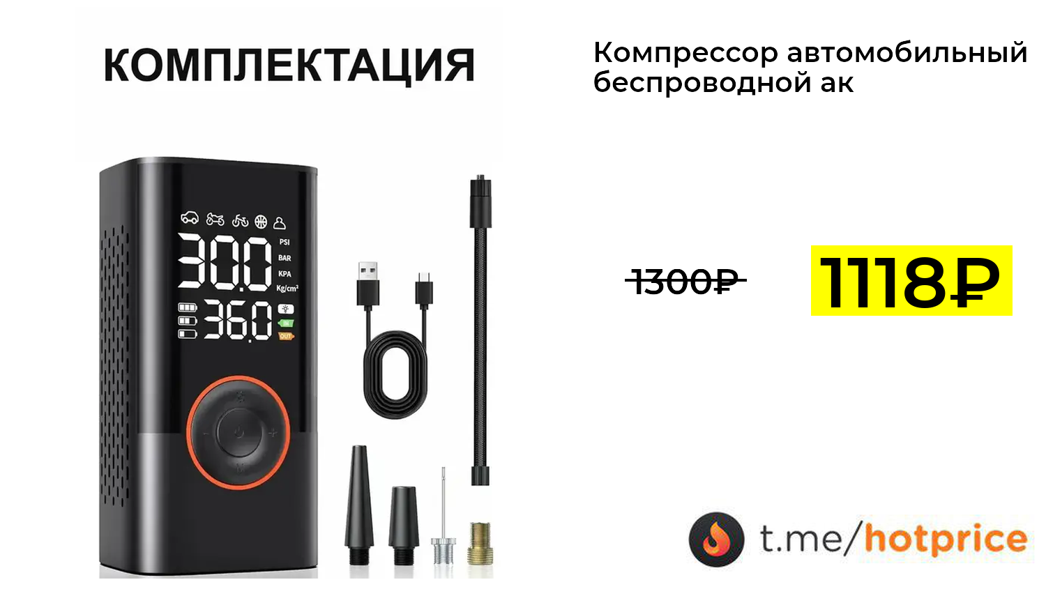 🔹 Компрессор автомобильный беспроводной аккумуляторный (с ВБ кошельком) за 1118₽ ❗️ (везде: 1300+₽)