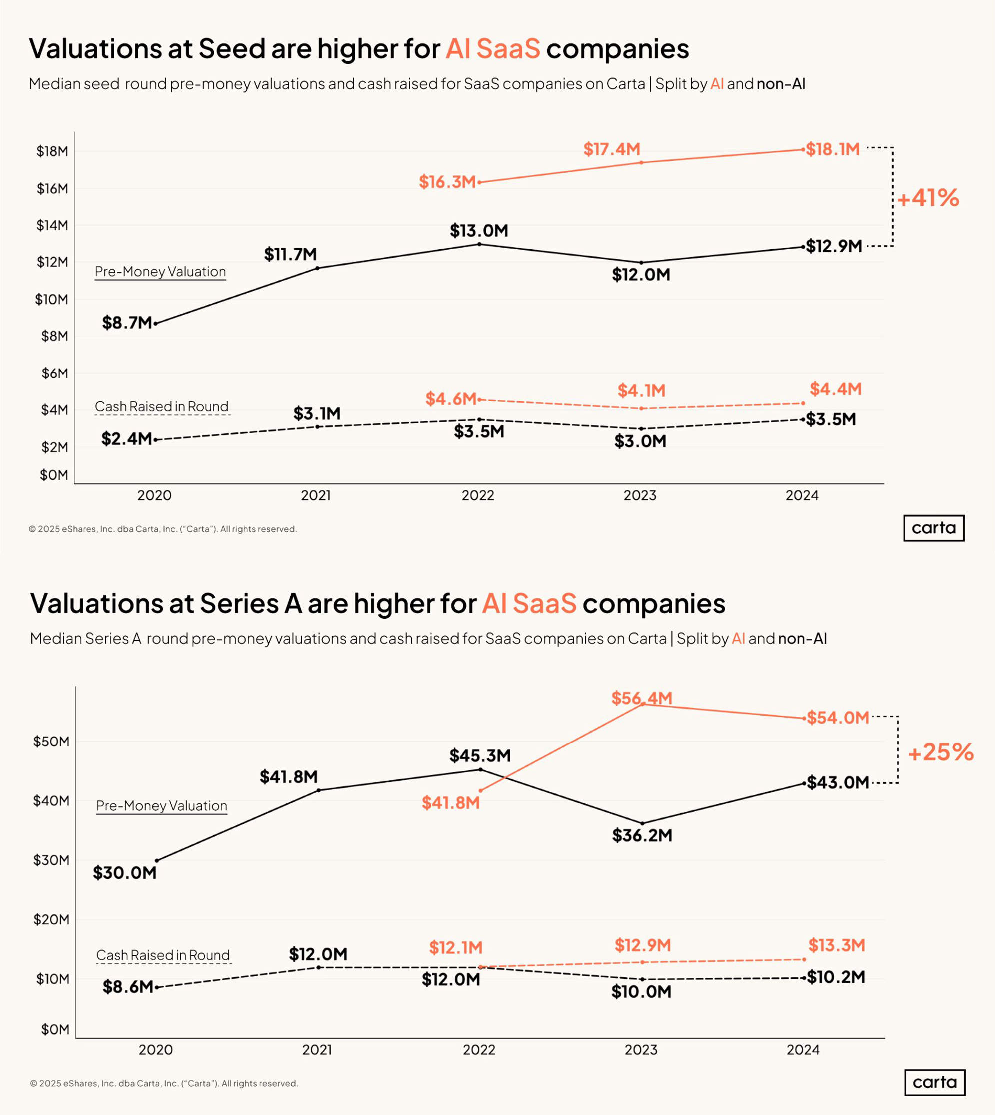 🤖 AI стартапы оцениваются на 25-40% дороже на Seed/Series A – Carta State of VC 2025.