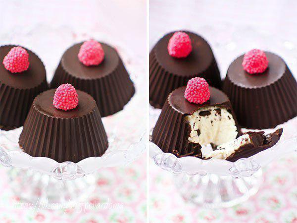 2. Если масса получится слишком густой, добавьте еще немного сгущенного молока. Оставшийся шоколад растапиваем на водяной бане. Шоколадные формочки заполняем творожной массой, на ней распределяем оставшийся шоколад и снова отправляем формочки в холодильник минимум на 20 минут.